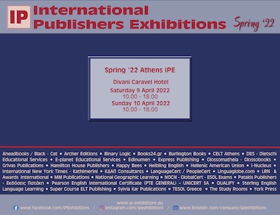 Μετά από δύο χρόνια αποχής λόγω της πανδημίας, οι International Publishers Exhibitions (IPEs) επιστρέφουν δυναμικά με την Spring ’22 Athens IPE. Η μεγαλύτερη έκθεση ξενόγλωσσης εκπαίδευσης στην Ελλάδα θα πραγματοποιηθεί το Σάββατο, 9 Απριλίου 2022, 10.00 – 18.00, και την Κυριακή, 10 Απριλίου 2022, 10.00 – 18.00, στο ξενοδοχείο Divani Caravel.